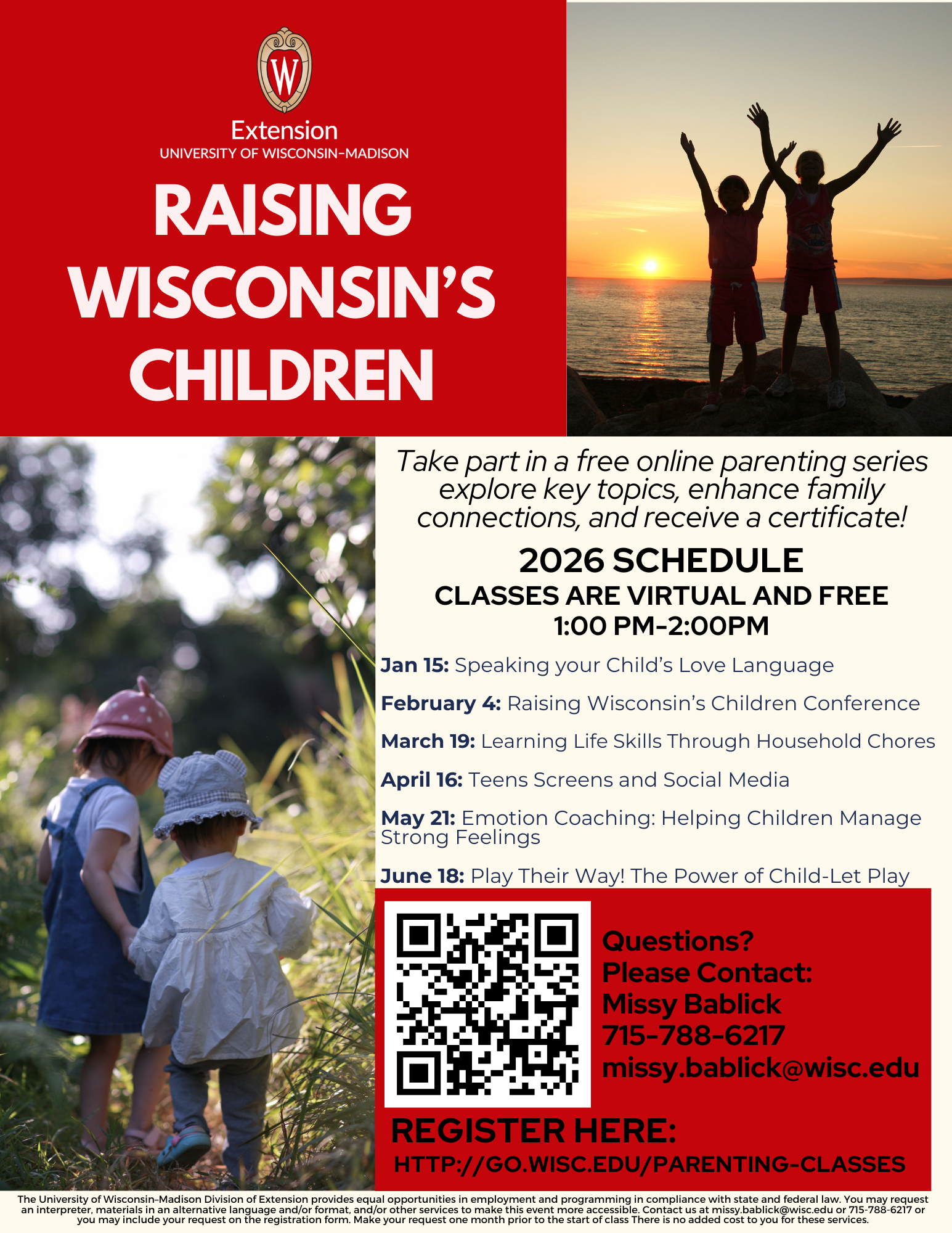 Join UW-Madison Division of Extension colleagues from across the state of Wisconsin for free online parenting class every 3rd Thursday at 1 PM. Connect with other parents. Get practical, positive parenting ideas. Help children grow. For more information, registration, and a full schedule for 2025 classes click here